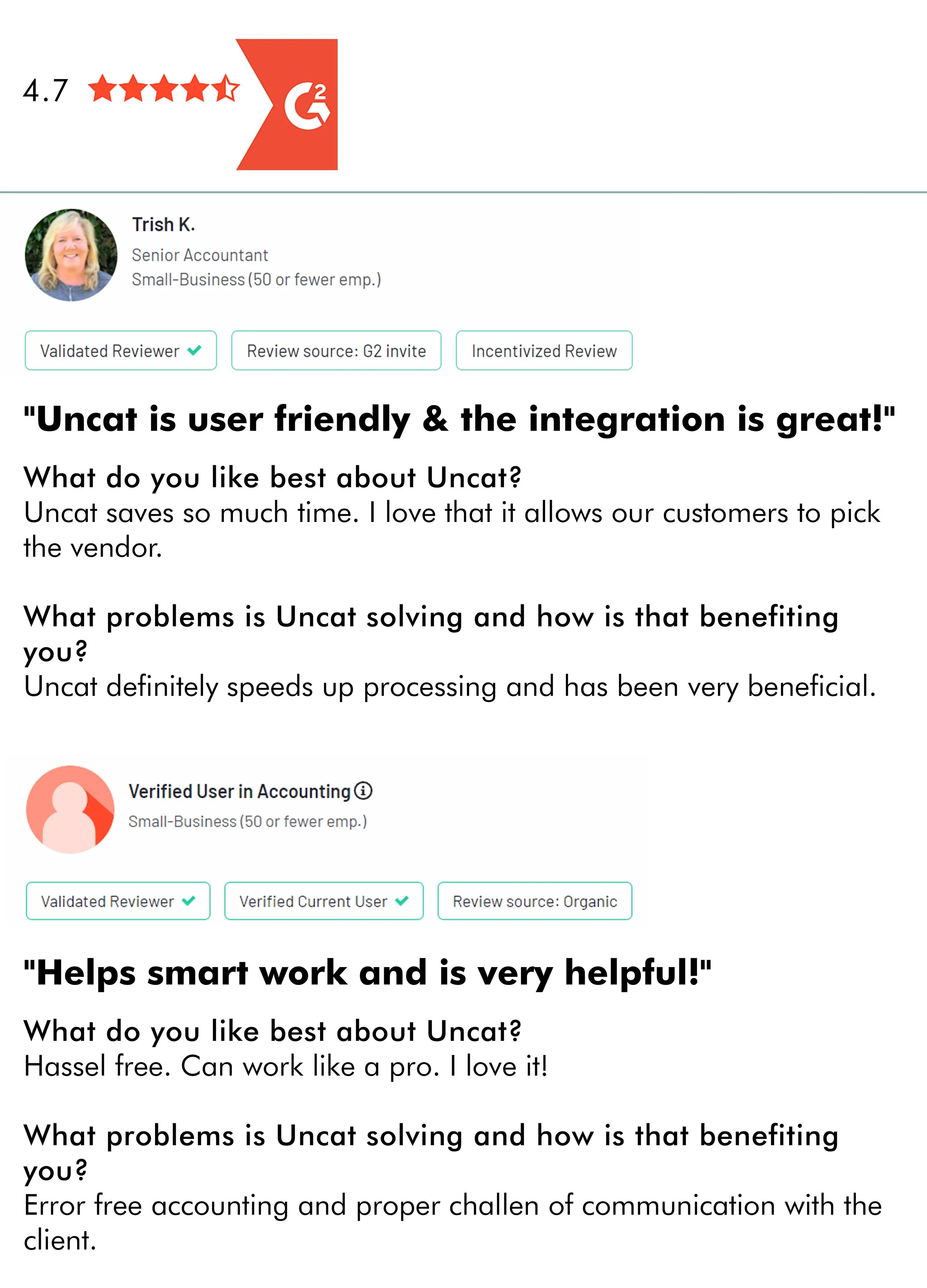 Built on 2-way sync with QuickBooks Online, QuickBooks Desktop, and Xero, Uncat helps you get information back from your accounting and bookkeeping clients faster so you can accurately categorize transactions and close the books. Just $9/month/client. Unlimited users. Unlimited transactions. Unlimited client requests. Unlimited receipt matching.