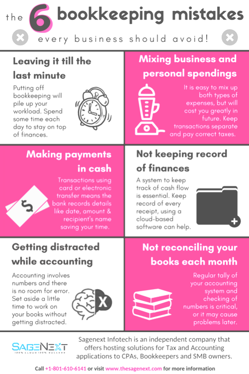 However, this infographic cautions you on what you should NOT do by listing six common bookkeeping mistakes you should avoid. For example, not keeping a record of finances and not reconciling your books each month are huge mistakes bookkeepers make that damage them in the long run.